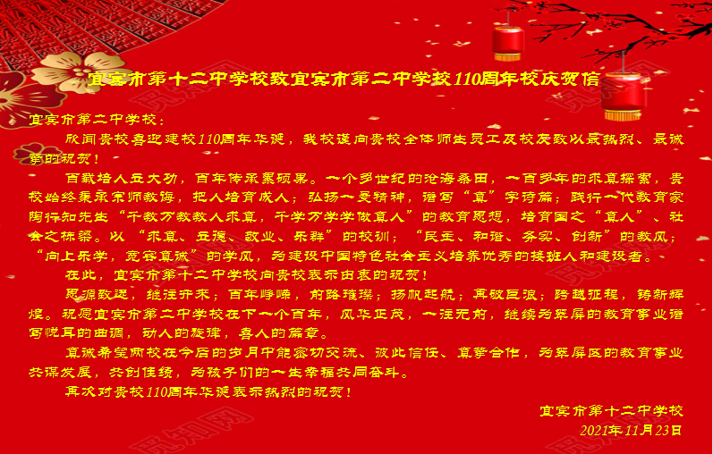 宜宾市第十二中学校致宜宾市第二中学校110周年校庆贺信