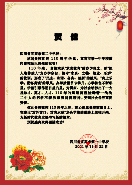 宜宾市一中致宜宾市二中的贺信