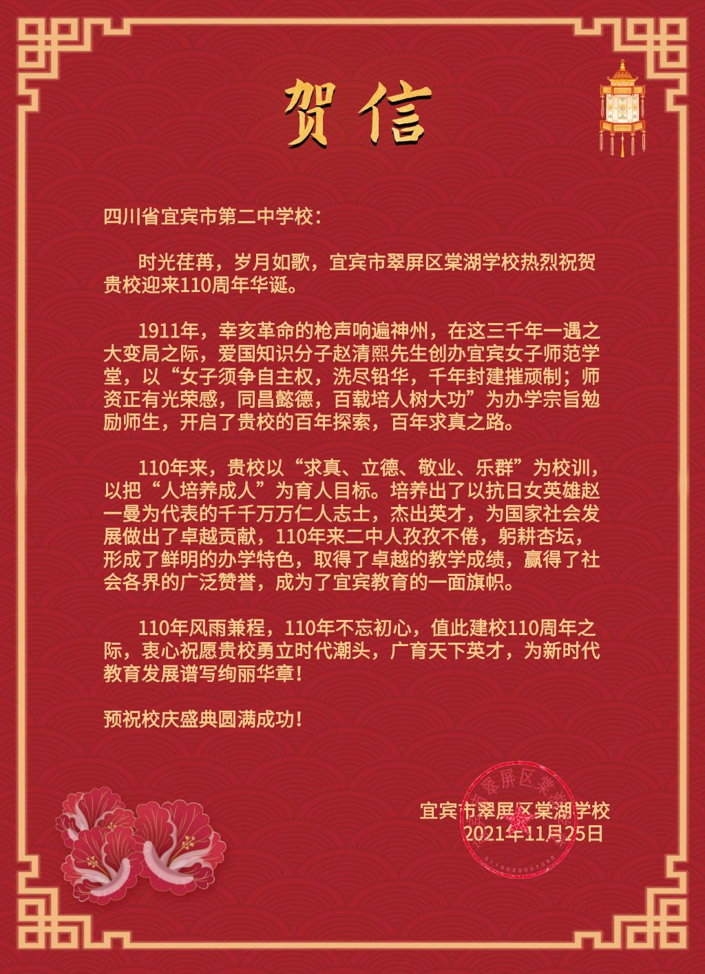 宜宾市翠屏区棠湖学校给宜宾市二中的贺信